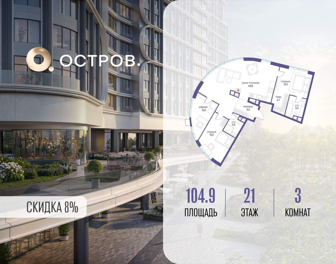 Продаётся 3-комн. квартира от застройщика: общая площадь 104.90 м, жилая 40.30 м, кухня 45.80 м, 21-й этаж, жилой квартал «Остров 7», корпус 7 (секция 2) . Срок сдачи: 3 квартал 2028 года.