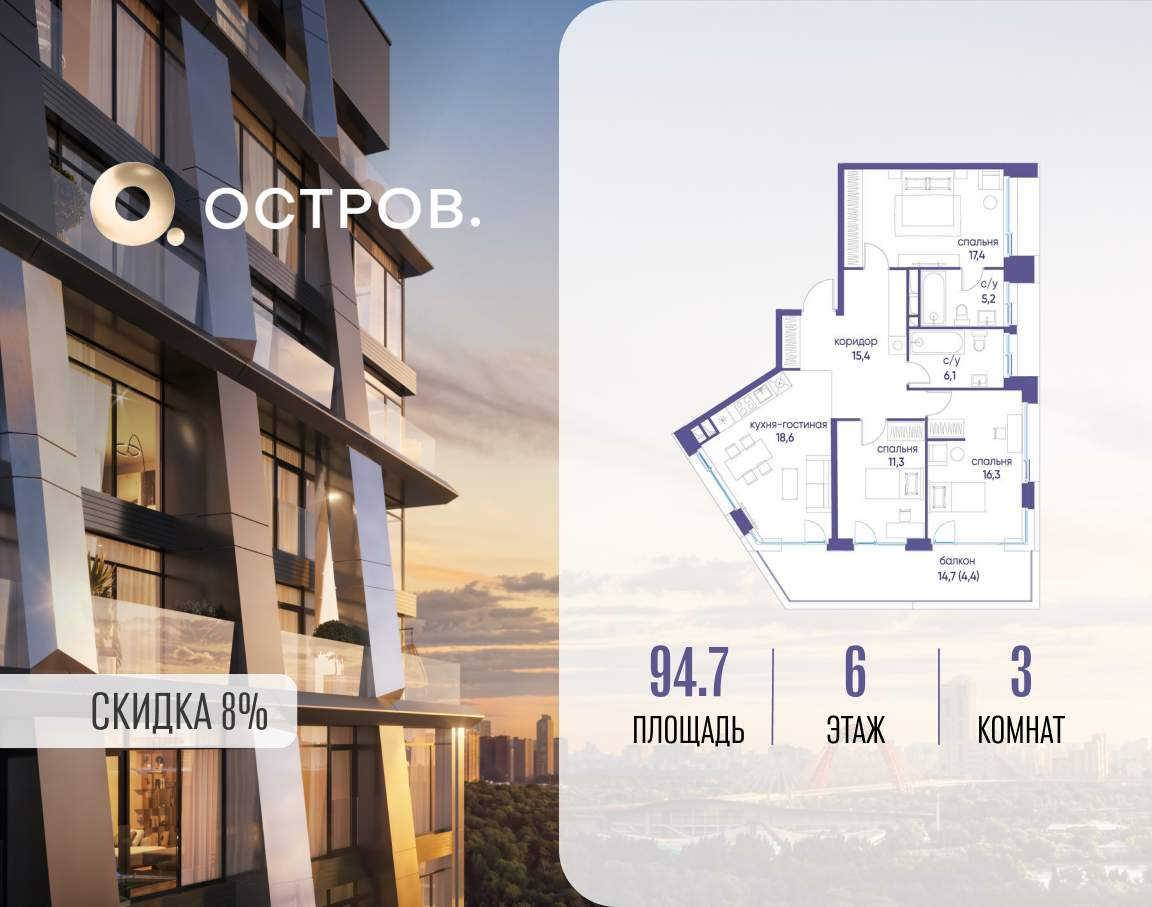 Продаётся 3-комн. квартира от застройщика: общая площадь 94.70 м, жилая 45.00 м, кухня 18.60 м, 6-й этаж, жилой квартал «Остров 12», корпус 1 (секция 1) . Срок сдачи: 1 квартал 2029 года.