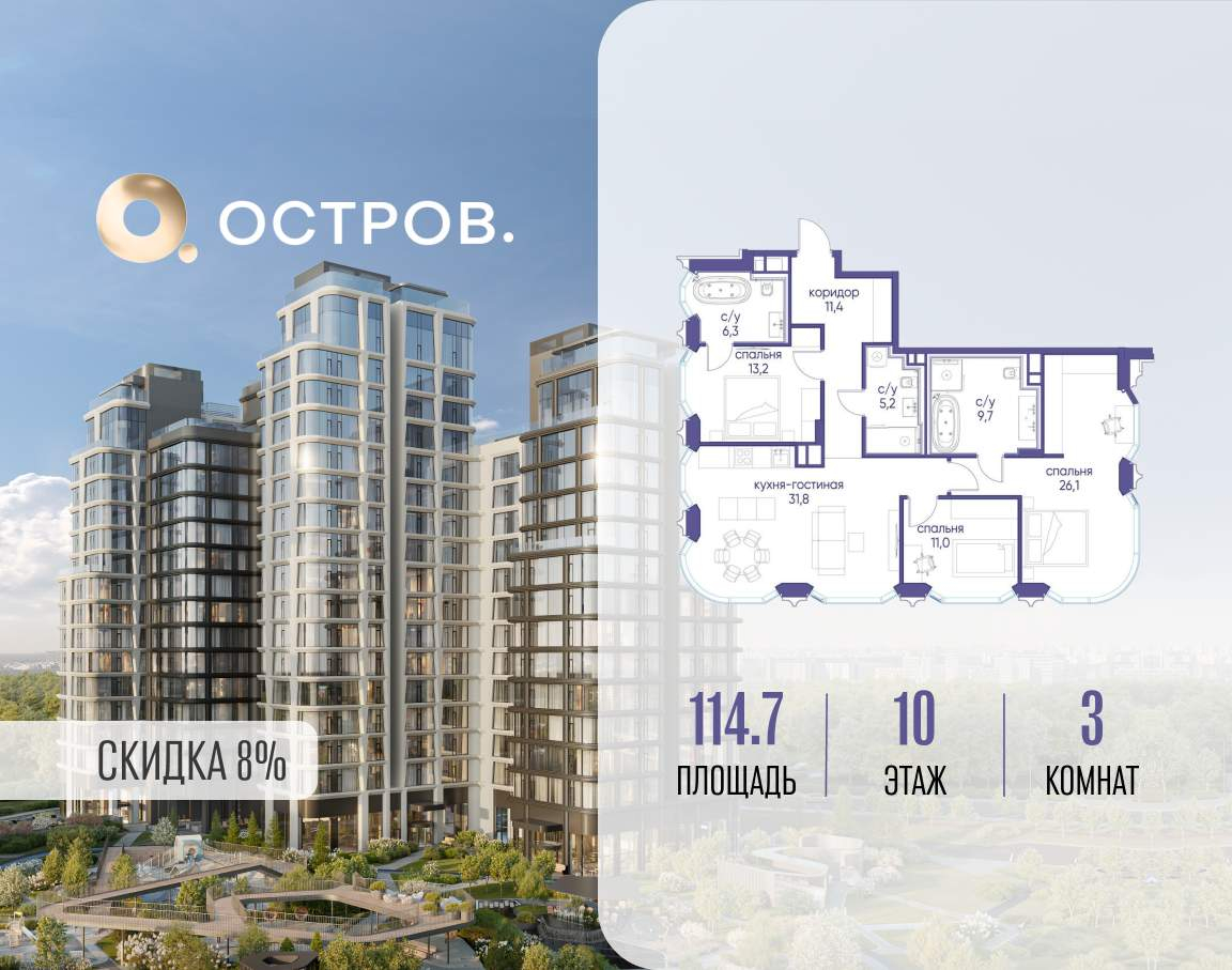 Продаётся 3-комн. квартира от застройщика: общая площадь 114.70 м, жилая 50.30 м, кухня 31.80 м, 10-й этаж, жилой квартал «Остров 12», корпус 2 (секция 1) . Срок сдачи: 1 квартал 2029 года.