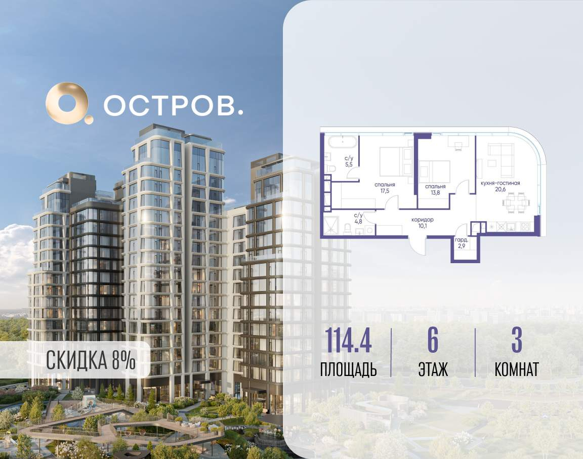 Продаётся 3-комн. квартира от застройщика: общая площадь 114.40 м, жилая 31.30 м, кухня 20.60 м, 6-й этаж, жилой квартал «Остров 12», корпус 2 (секция 1) . Срок сдачи: 1 квартал 2029 года.