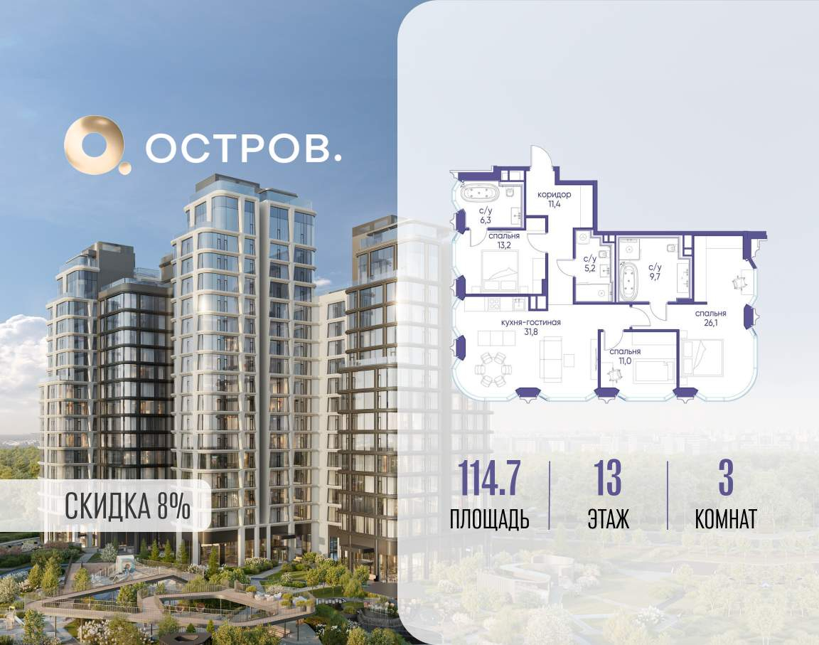 Продаётся 3-комн. квартира от застройщика: общая площадь 114.70 м, жилая 50.30 м, кухня 31.80 м, 13-й этаж, жилой квартал «Остров 12», корпус 2 (секция 1) . Срок сдачи: 1 квартал 2029 года.