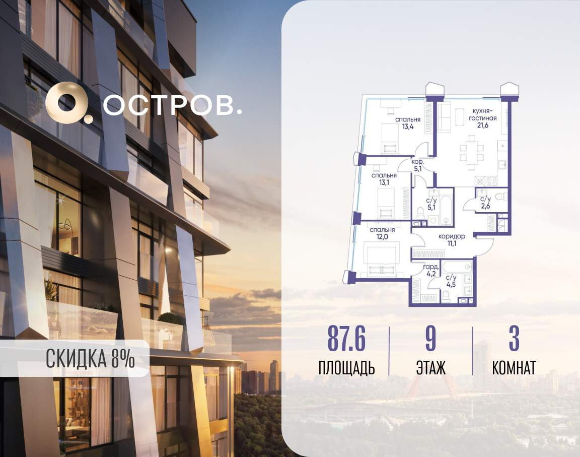 Продаётся 3-комн. квартира от застройщика: общая площадь 87.60 м, жилая 38.50 м, кухня 21.60 м, 9-й этаж, жилой квартал «Остров 12», корпус 3 (секция 1) . Срок сдачи: 1 квартал 2029 года.