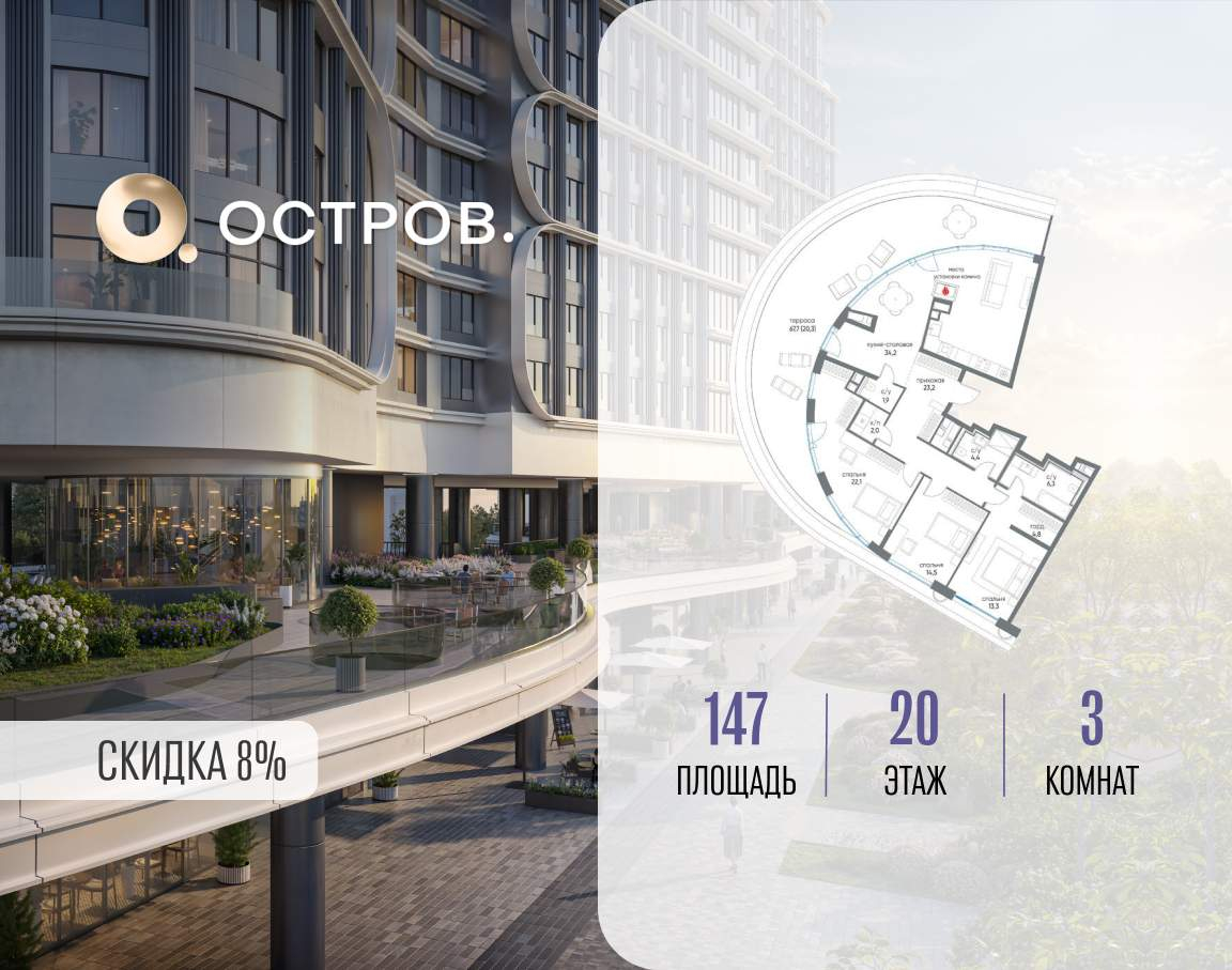 Продаётся 3-комн. квартира от застройщика: общая площадь 147.00 м, жилая 49.90 м, кухня 34.20 м, 20-й этаж, жилой квартал «Остров 7», корпус 7 (секция 1) . Срок сдачи: 3 квартал 2028 года.