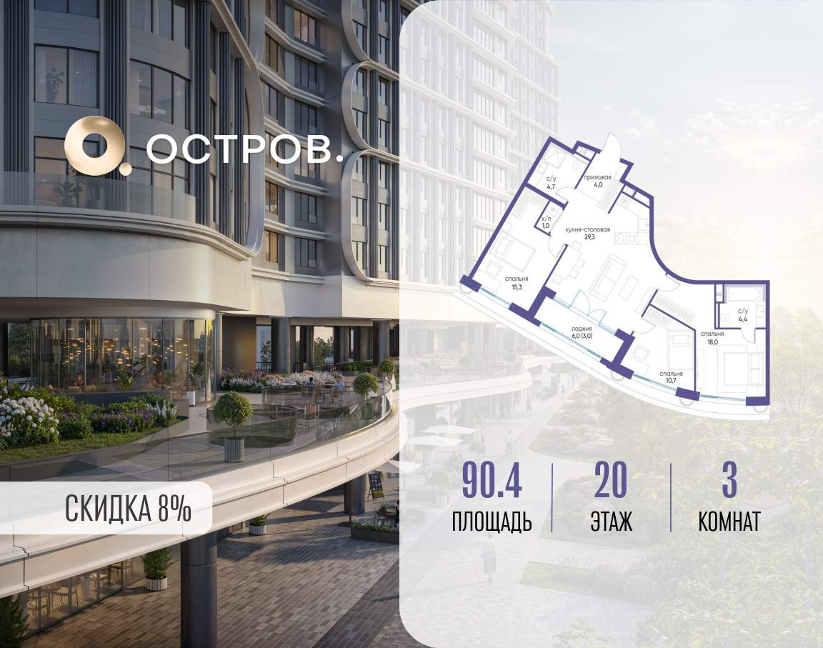Продаётся 3-комн. квартира от застройщика: общая площадь 90.40 м, жилая 44.00 м, кухня 29.30 м, 20-й этаж, жилой квартал «Остров 7», корпус 7 (секция 1) . Срок сдачи: 3 квартал 2028 года.