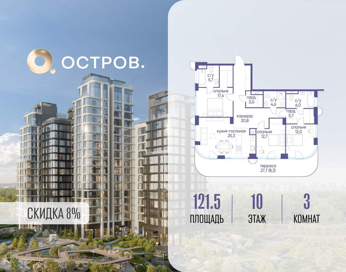 Продаётся 3-комн. квартира от застройщика: общая площадь 121.50 м, жилая 42.10 м, кухня 25.30 м, 10-й этаж, жилой квартал «Остров 12», корпус 1 (секция 1) . Срок сдачи: 1 квартал 2029 года.