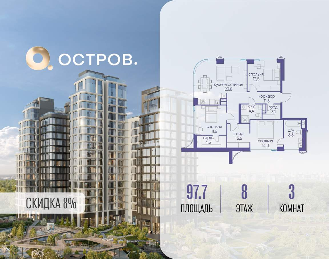 Продаётся 3-комн. квартира от застройщика: общая площадь 97.70 м, жилая 38.10 м, кухня 23.80 м, 8-й этаж, жилой квартал «Остров 12», корпус 1 (секция 2) . Срок сдачи: 1 квартал 2029 года.