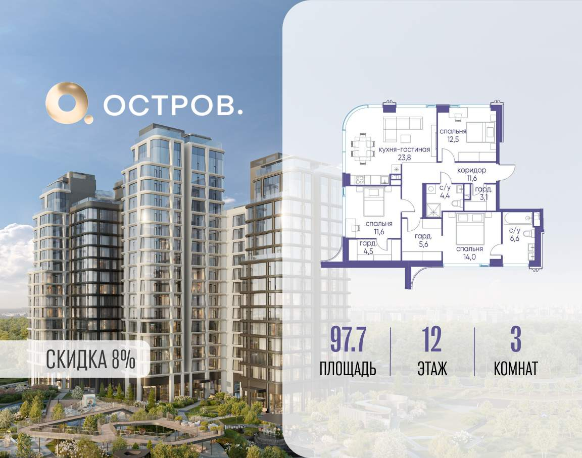 Продаётся 3-комн. квартира от застройщика: общая площадь 97.70 м, жилая 38.10 м, кухня 23.80 м, 12-й этаж, жилой квартал «Остров 12», корпус 1 (секция 2) . Срок сдачи: 1 квартал 2029 года.