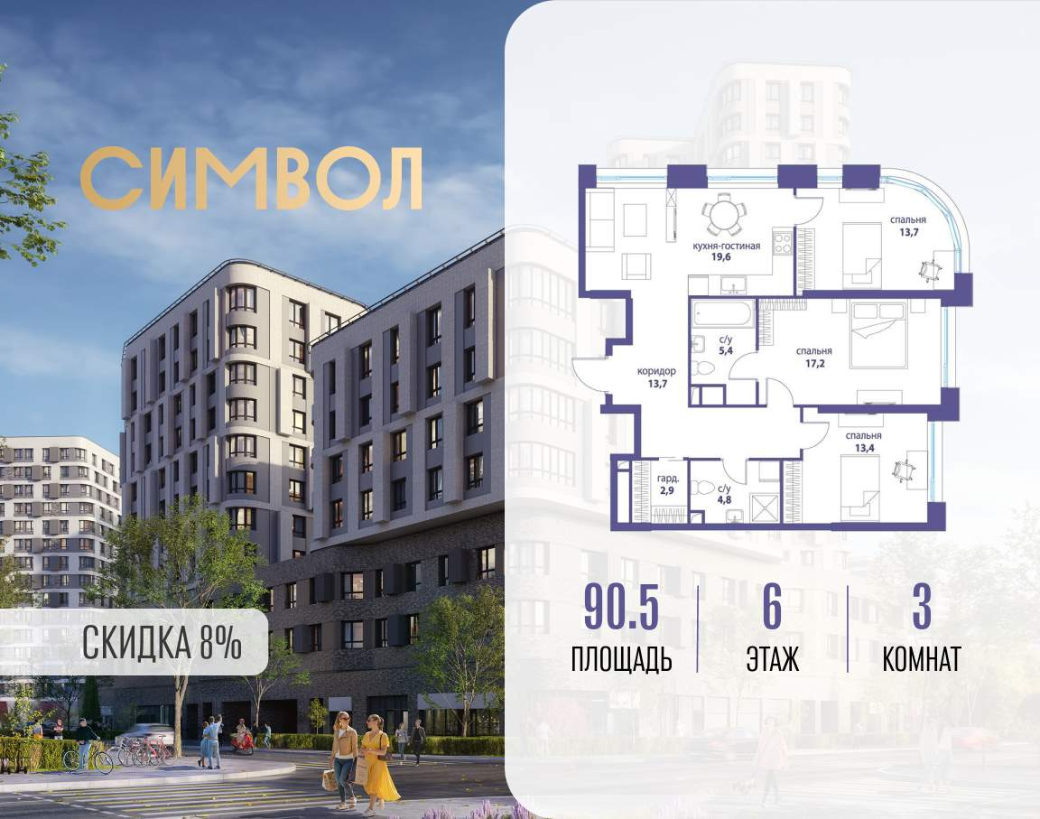 Продается 3-комнатная квартира от застройщика: общая площадь 90.50 м, жилая 44.30 м, кухня 19.60 м, 6-й этаж, жилой квартал «Вдохновение», корпус 30 (секция 1) . Срок сдачи: 4 квартал 2025 года.