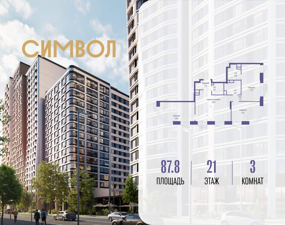 Продается 3-комнатная квартира от застройщика: общая площадь 87.80 м, жилая 46.20 м, кухня 24.20 м, 21-й этаж, жилой квартал «Гордость», корпус 36 (секция 2) . Срок сдачи: 2 квартал 2029 года.