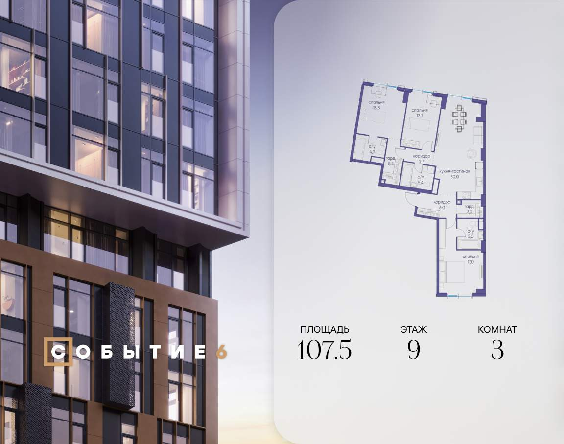 Продаётся 3-комнатная квартира от застройщика: общая площадь 107.50 м, жилая 35.20 м, кухня 30.00 м, 9-й этаж, жилой квартал «Событие-6», корпус 2 (секция 5) Срок сдачи: 4 квартал 2029 года.