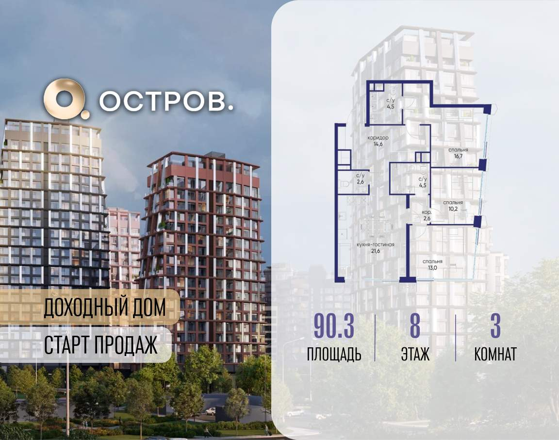 Продаётся 3-комн. квартира от застройщика: общая площадь 90.30 м, жилая 39.90 м, кухня 21.60 м, 8-й этаж, жилой квартал «Остров 14», корпус 6 (секция 1) . Срок сдачи: 2 квартал 2029 года.