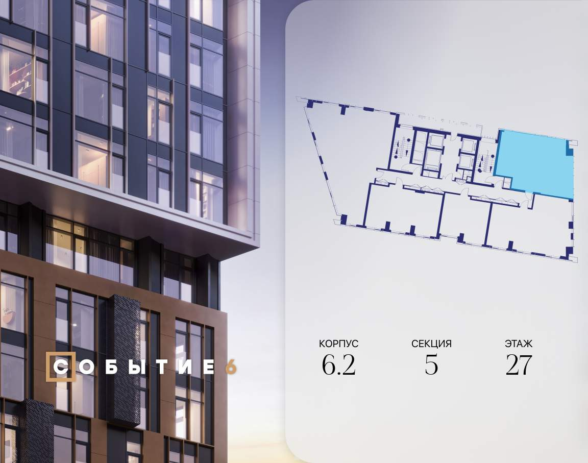 Продаётся 3-комнатная квартира от застройщика: общая площадь 76.90 м, жилая 41.80 м, кухня 17.60 м, 27-й этаж, жилой квартал «Событие-6», корпус 2 (секция 5) Срок сдачи: 4 квартал 2029 года.