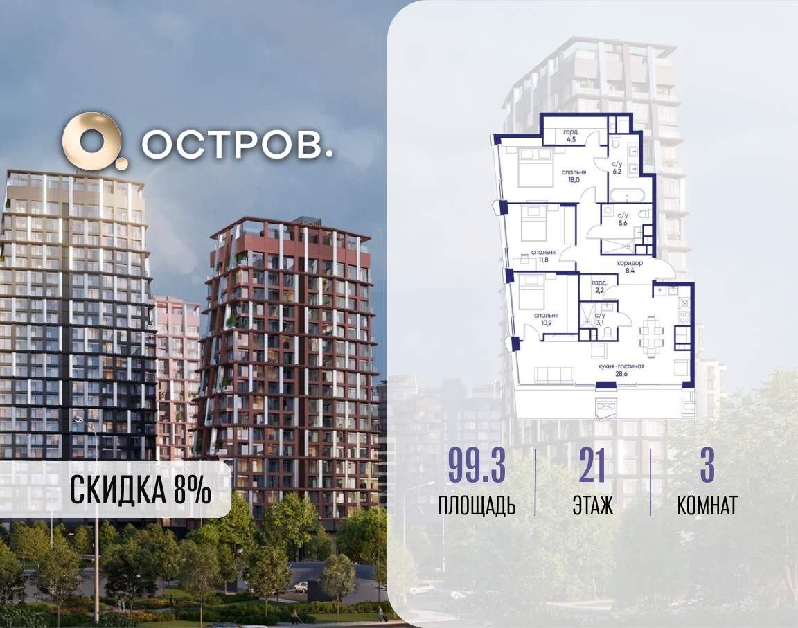 Продаётся 3-комн. квартира от застройщика: общая площадь 99.30 м, жилая 40.70 м, кухня 28.60 м, 21-й этаж, жилой квартал «Остров 14», корпус 4 (секция 1) . Срок сдачи: 2 квартал 2029 года.