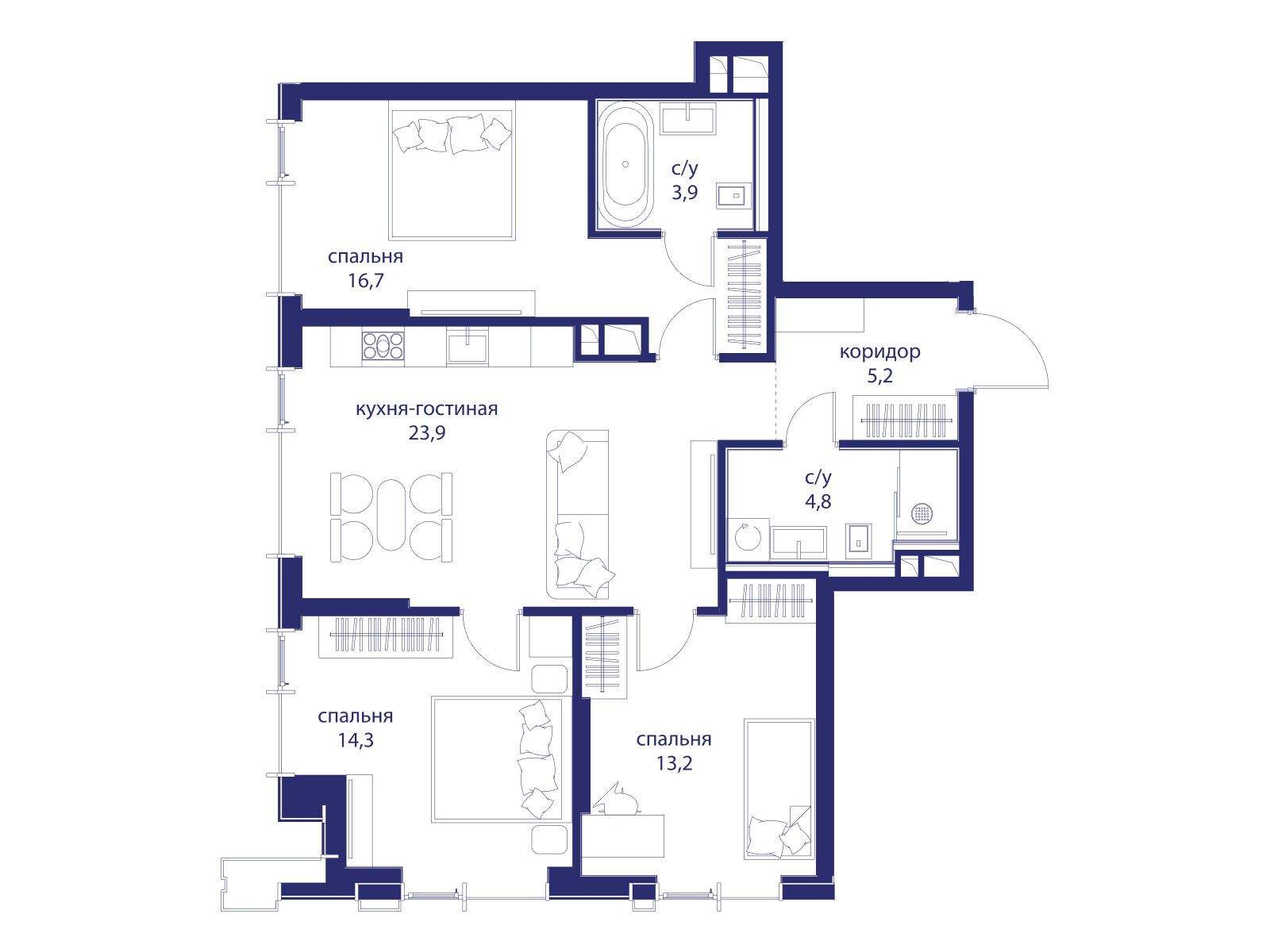 Продаётся 3-комнатная квартира от застройщика: общая площадь 82.00 м, жилая 44.20 м, кухня 23.90 м, 7-й этаж, жилой квартал «Событие-6», корпус 1 (секция 3) Срок сдачи: 4 квартал 2029 года.