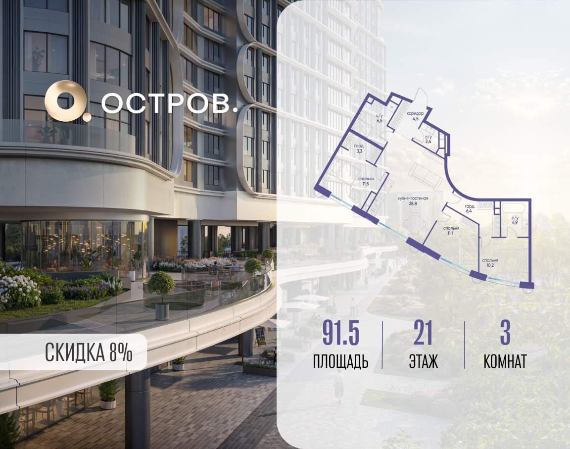 Продаётся 3-комн. квартира от застройщика: общая площадь 91.50 м, жилая 34.00 м, кухня 29.30 м, 21-й этаж, жилой квартал «Остров 7», корпус 7 (секция 2) . Срок сдачи: 3 квартал 2028 года.