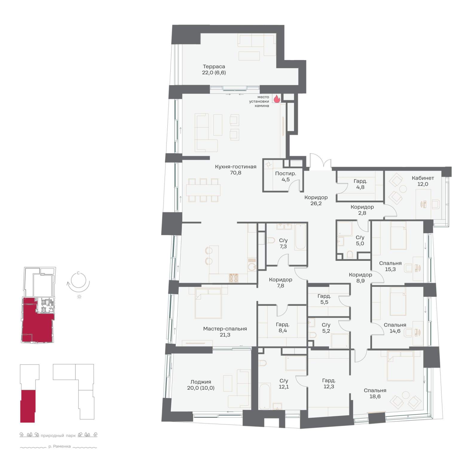 Подземная парковка, парковка охраняется. Обеспечение безопасности: видеонаблюдение, круглосуточная охрана, консьерж, противопожарная система, пропускная система. Инфраструктура: детские площадки, спортивные площадки, места для отдыха, рестораны, фитнес-центр, коммерческие объекты.