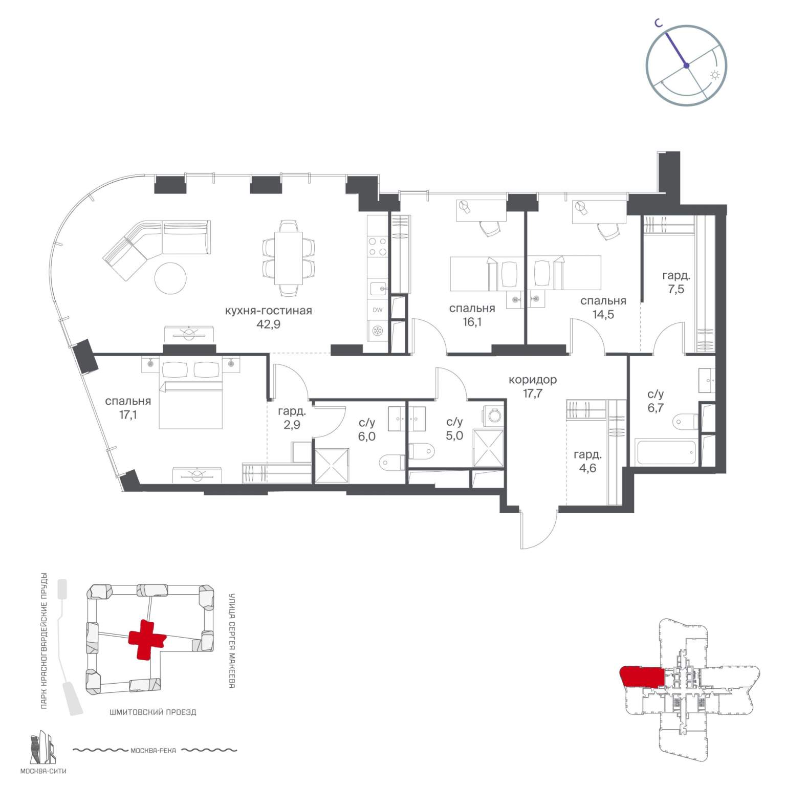 Квартира располагается на 6 этаже 16-этажного дома в ЖК Река.