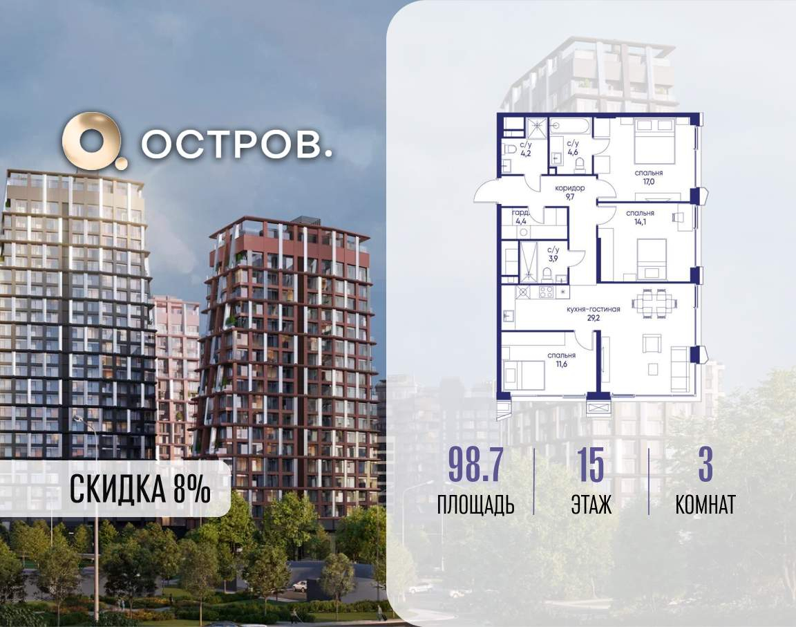 Продаётся 3-комн. квартира от застройщика: общая площадь 98.70 м, жилая 42.70 м, кухня 29.20 м, 15-й этаж, жилой квартал «Остров 14», корпус 4 (секция 1) . Срок сдачи: 2 квартал 2029 года.