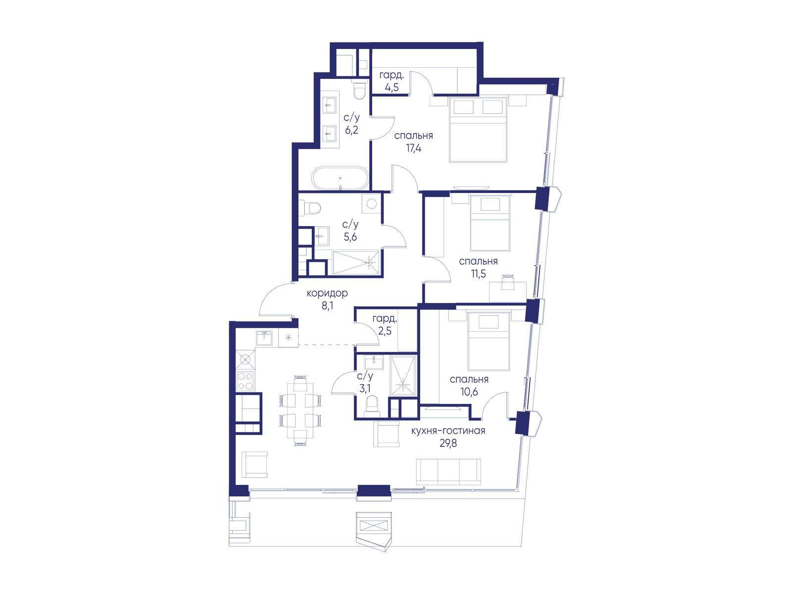 Продаётся 3-комн. квартира от застройщика: общая площадь 99.30 м, жилая 39.50 м, кухня 29.80 м, 21-й этаж, жилой квартал «Остров 14», корпус 6 (секция 1) . Срок сдачи: 2 квартал 2029 года.
