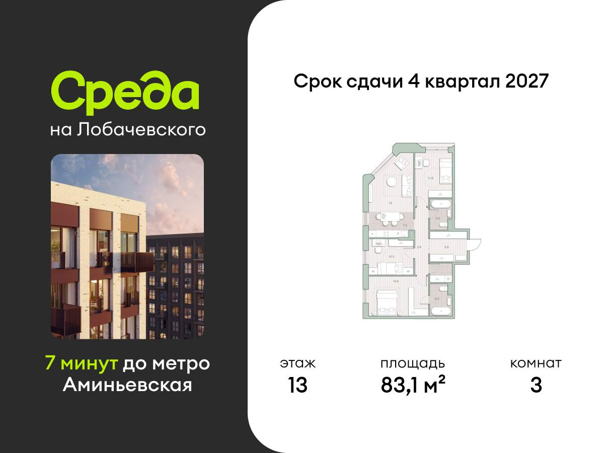 Продаётся трехкомнатная квартира общей площадью 71.30 кв. м. с отделкой на выбор: черновая, White Box. Квартира на 13 этаже корпуса 5.1 в жилом комплексе бизнес-класса «Среда на Лобачевского». До метро «Аминьевская» 7 минут пешком.