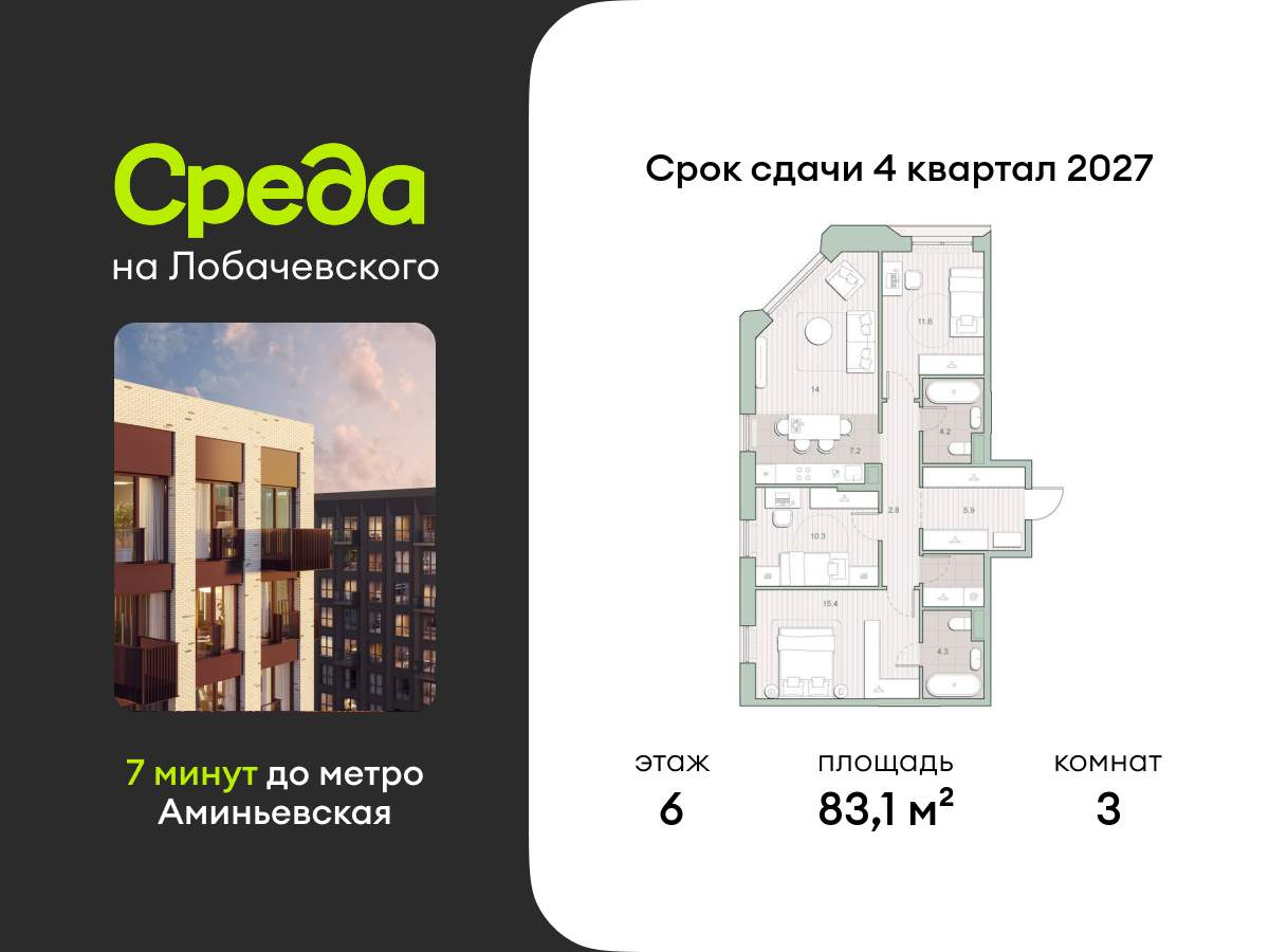 Продаётся трехкомнатная квартира общей площадью 83.10 кв. м. с отделкой на выбор: черновая, White Box. Квартира на 6 этаже корпуса 5.7 в жилом комплексе бизнес-класса «Среда на Лобачевского». До метро «Аминьевская» 7 минут пешком.