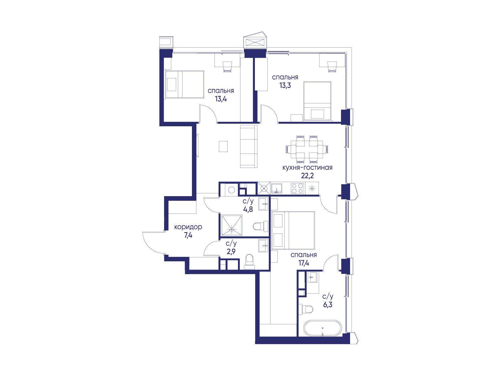 Продаётся 3-комн. квартира от застройщика: общая площадь 87.70 м, жилая 44.10 м, кухня 22.20 м, 14-й этаж, жилой квартал «Остров 14», корпус 4 (секция 1) . Срок сдачи: 2 квартал 2029 года.
