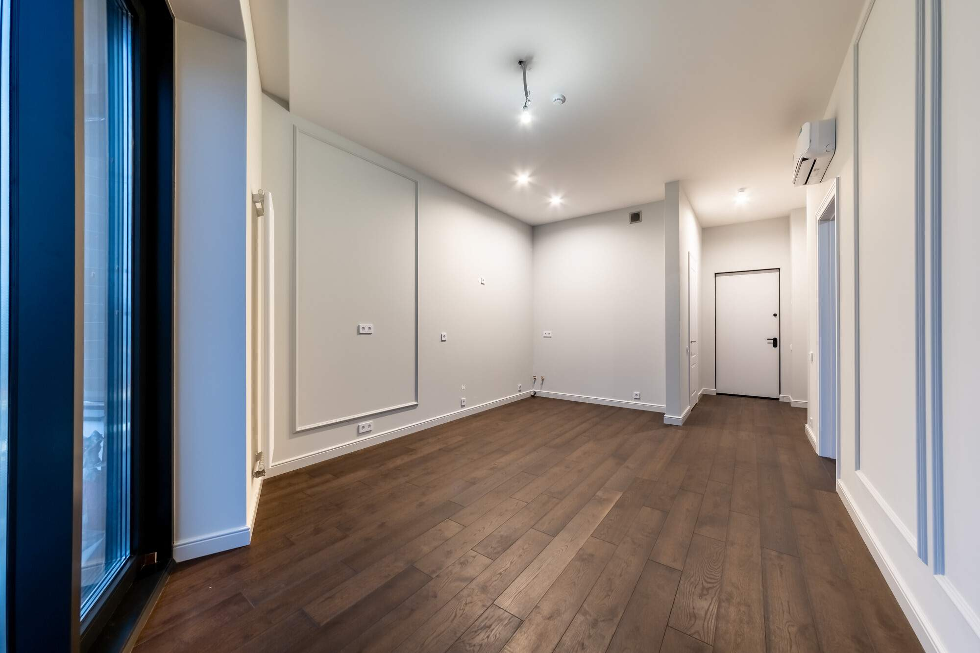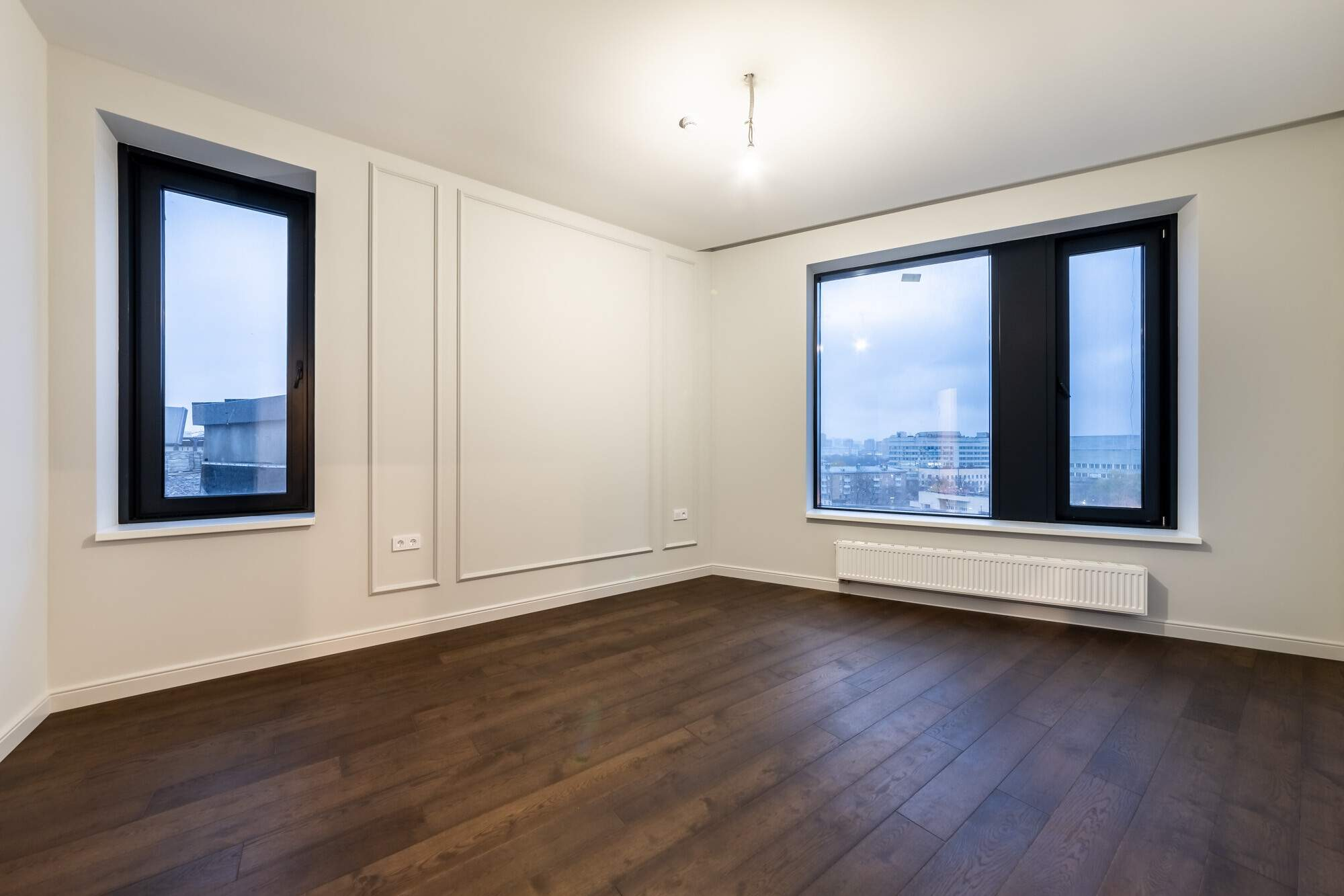 Отделка выполнена из высококачественных материалов: на полу - инженерная доска, на стенах - финишная покраска, потолок из ГКЛ белого цвета с нишами под шторы. Установлены точёные светильники и сделаны выводы под люстры. В каждой комнате будет установлена сплит-система с внутренним и внешним блоком, электрофурнитура (розетки, выключатели) . В санузлах установлена вся сантехника, тумбочка под раковину, оборудован теплый пол. Благодаря увеличенным окнам и высоким потолкам квартира наполнится светом и воздухом.