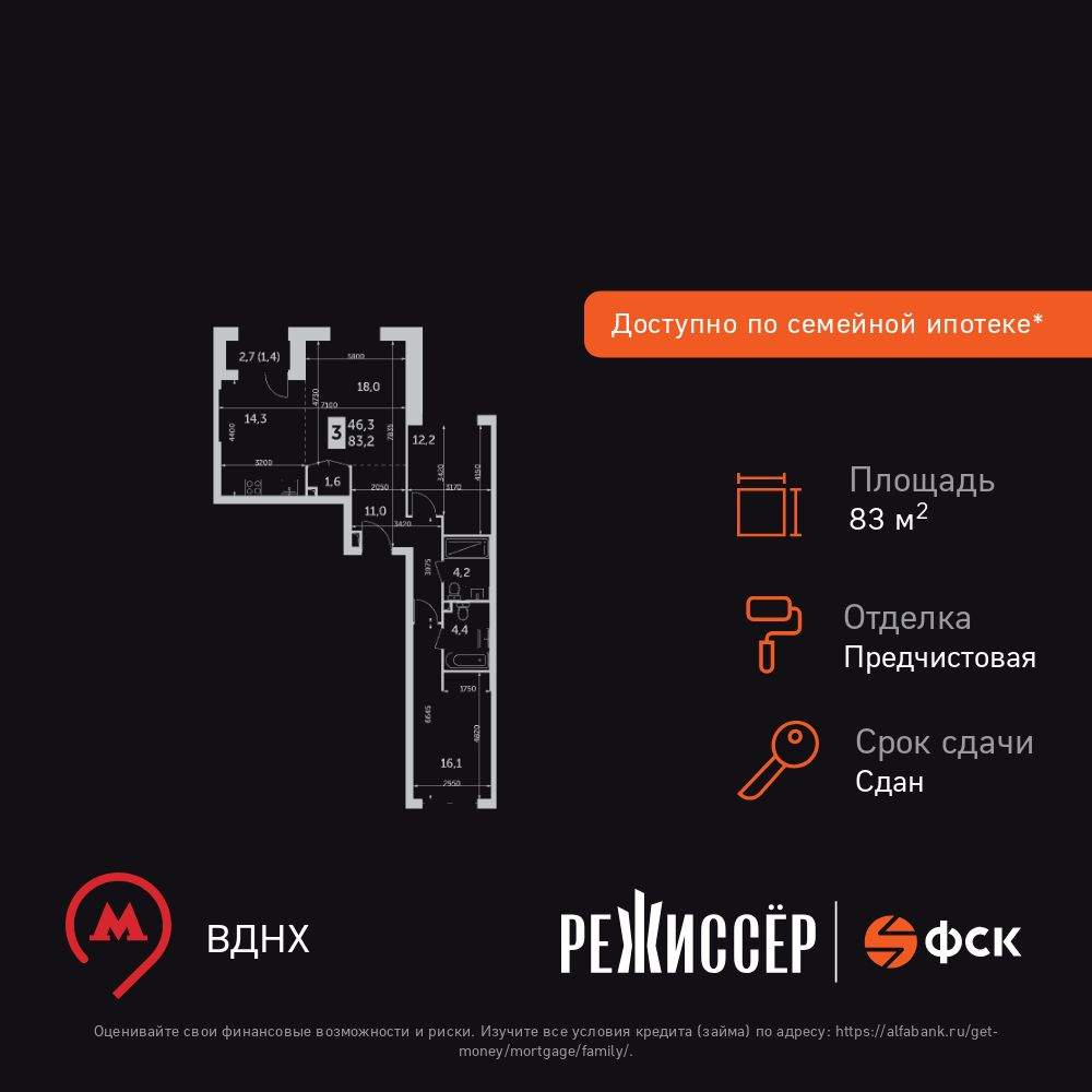 Жилая площадь 46.3 кв. м, кухня 14.3 кв. м, ремонта нет, окна выходят во двор.